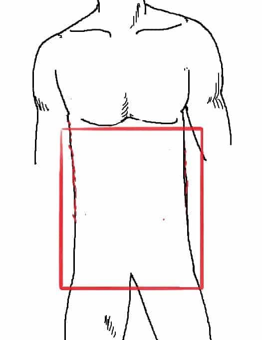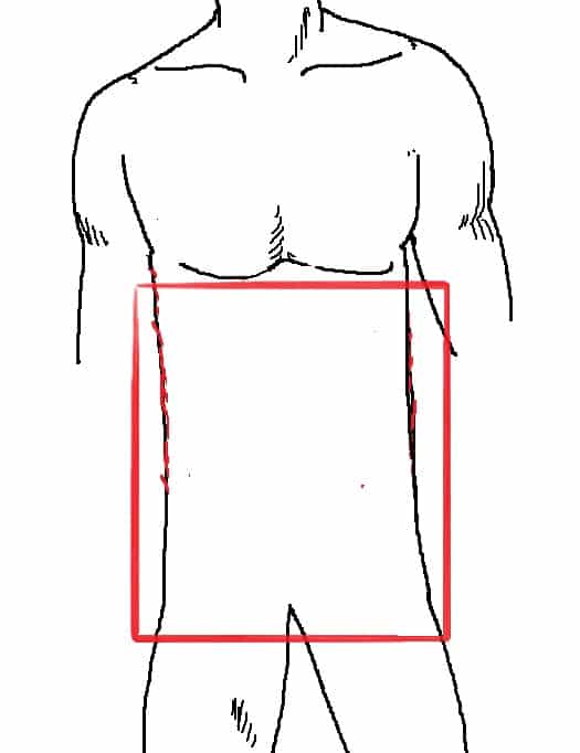 其實敝人發現標題這樣下好像也不是很恰當,因為基本上核心肌群這東東本來就是隨時支撐你的身體於無形中。核心肌群的位置約略就是從你的胸部下沿到大腿這一段的腹背肌肉群,如下圖。請原諒我畫得這麼簡陋QQ,因為他是由很多的肌肉、由淺層到深層所組成,我不知掉怎麼在2D的平面一次呈現(該是學 Flash 的時候了!)。平常許多人最喜歡練的六塊肌,其實只是最淺層的核心肌群之一。