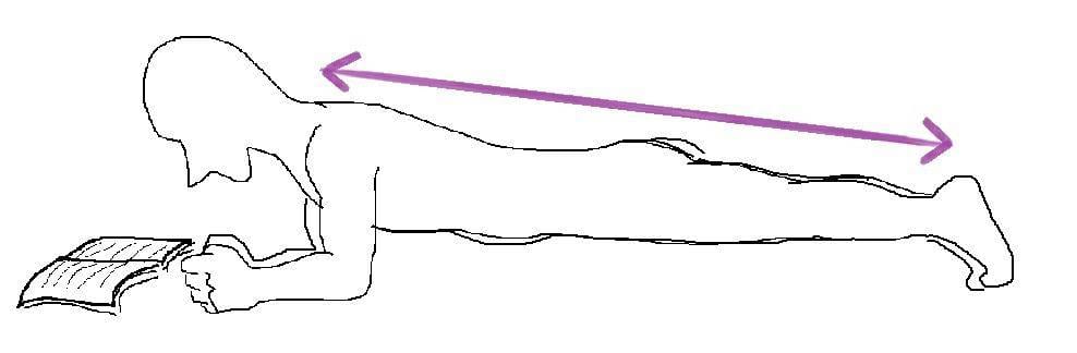 - 想趴在床上看書的時候,改用平板式 (plank) 代替(如下圖)。但其實除非有堅強的意志力,不然但最後應該書也看不太下去。敝人之前系上羽球隊的教練說,他以前當國手的時候,常常在家裡跟他妹 PK 誰可以用平板式撐比較久。一開始可能一兩分鐘就抖到不行了,但到後來撐了半天電視節目都快看完了還渾然不覺。控制肩膀不要聳起、腹肌和屁股用力收縮不要讓腰垮掉,同樣想像身體像一根棒子。如果一開始撐不起來,可以先用膝蓋著地的方式。(其實本人也撐不到 3 分鐘)