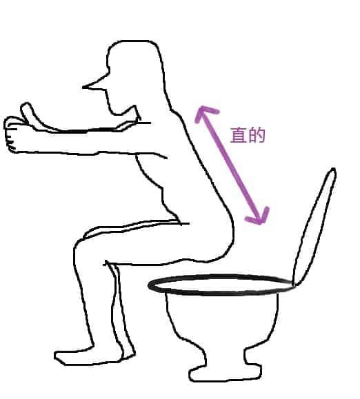 - 女生如廁上小號的時候,不要選蹲式馬桶而選坐式馬桶,然後背挺直蹲馬步上廁所(如下圖)。如圖。這個比較高難度,如果核心和大腿不夠強、又不慎累積太久沒上廁所的話,可能會無法支撐到最後。所以建議你可以先在沒有馬桶的狀況下訓練一下,請參考敝人練屁股的這篇文章。雖然一般男生上小號比較不會用到坐式馬桶,但如果你自認大腿和核心夠強,也是可以挑戰蹲馬步上大號。手往前伸是為了保持平衡,以免你一屁股坐下去(不是自家馬桶的話豈不是糟了?)。上半身可以再往前傾(不是往前彎喔),但是背始終是直的。