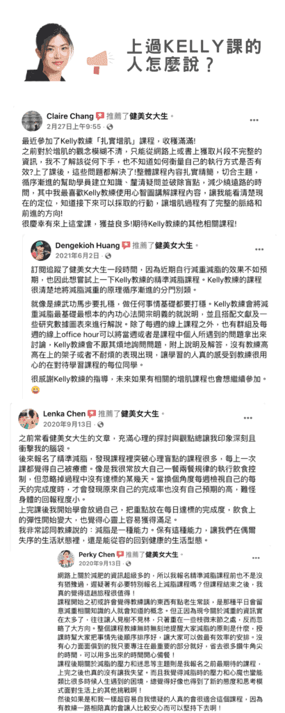 - 健身教學是 Kelly 教練超過 10 年的專業,Kelly 教練會教你安排「減脂有利導向」的運動計畫,適用一週 1 天到一週 5 天、一次10分鐘到1.5小時、在家運動或上健身房、零經驗到運動老手皆有適合的安排方式