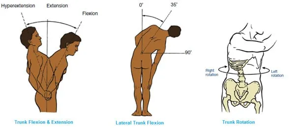 1. 彎曲:可以分成前曲(脊椎屈曲)、後曲(脊椎伸展)、左曲與右曲(脊椎側曲)