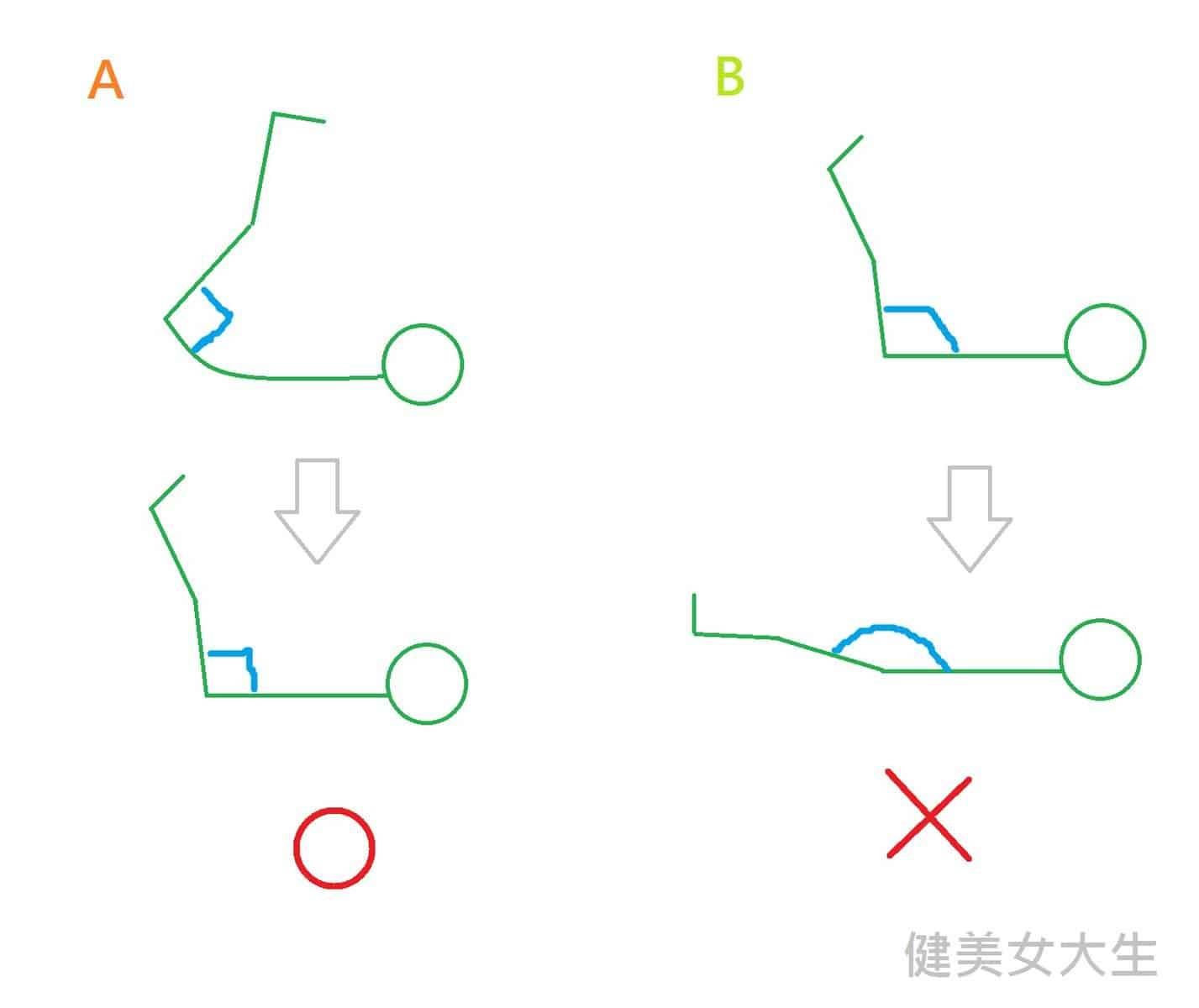 請記得我們要練的是肌肉A。下圖A是反向捲腹的正確做法,也就是骨盆順時針轉動、上半身和下半身的角度幾乎不變。B這個動作,也就是平躺抬腿,其實是一個爭議性很大的動作。她大部分練到的都是你的肌肉B,如同敝人先前說到的,若是肌肉B太強大,容易造成腰痠背痛與椎間盤突出。此外,如果你原本腹肌就不是很強壯,做平躺抬腿會讓你的腰椎受到很大拉力,你可能當場就會開始背痛。