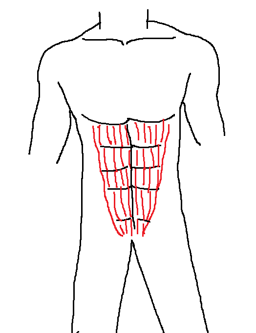 下面這張圖就是你做捲腹(crunch)這個動作時最主要練到的那條腹肌,稱他肌肉A。他從你的胸部下沿開始一路延伸到你的恥骨。先記住這件事。