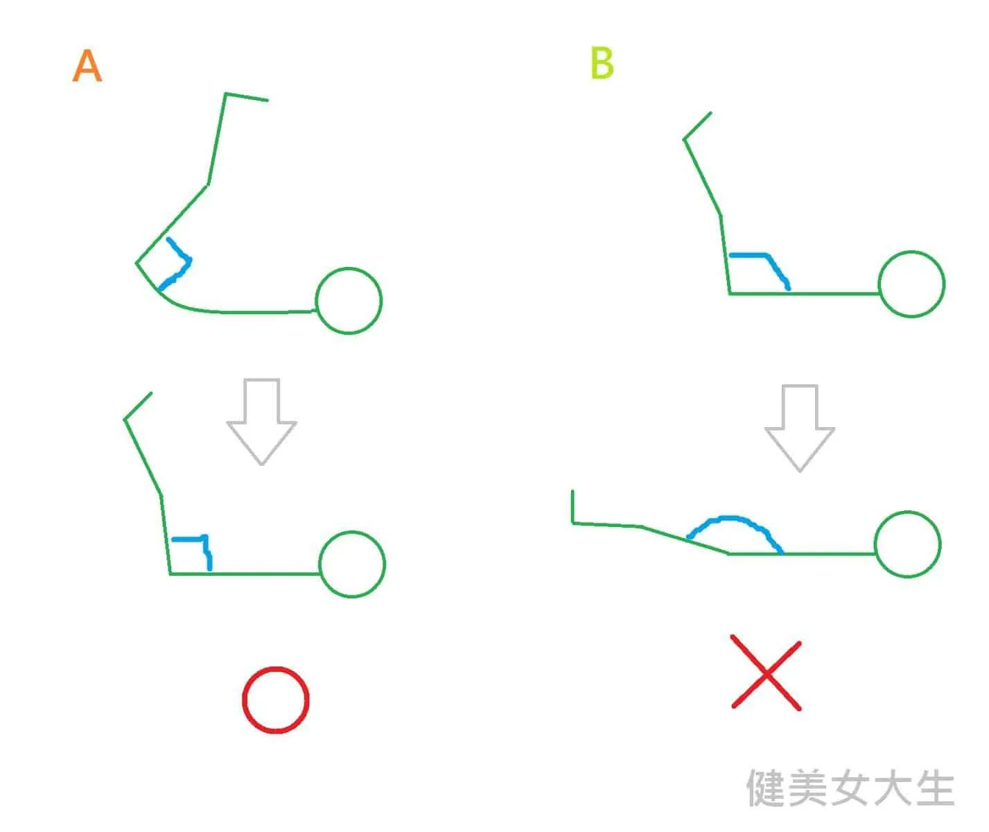 - 你的腿和你的上半身的夾腳是幾乎不變的。就是圖裡的藍色夾角。在動作啟動時,可能你會覺得把腳往身體彈一下會比較容易抬起骨盆,但那樣其實利用到了很多慣性,而不是腹肌的收縮。不過角度輕微的變動是可以接受的。