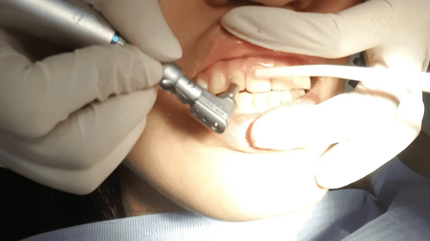 ↓ 醫師在一個類似電動牙刷的東西(他說那叫「慢速手機」)上沾磨砂膏