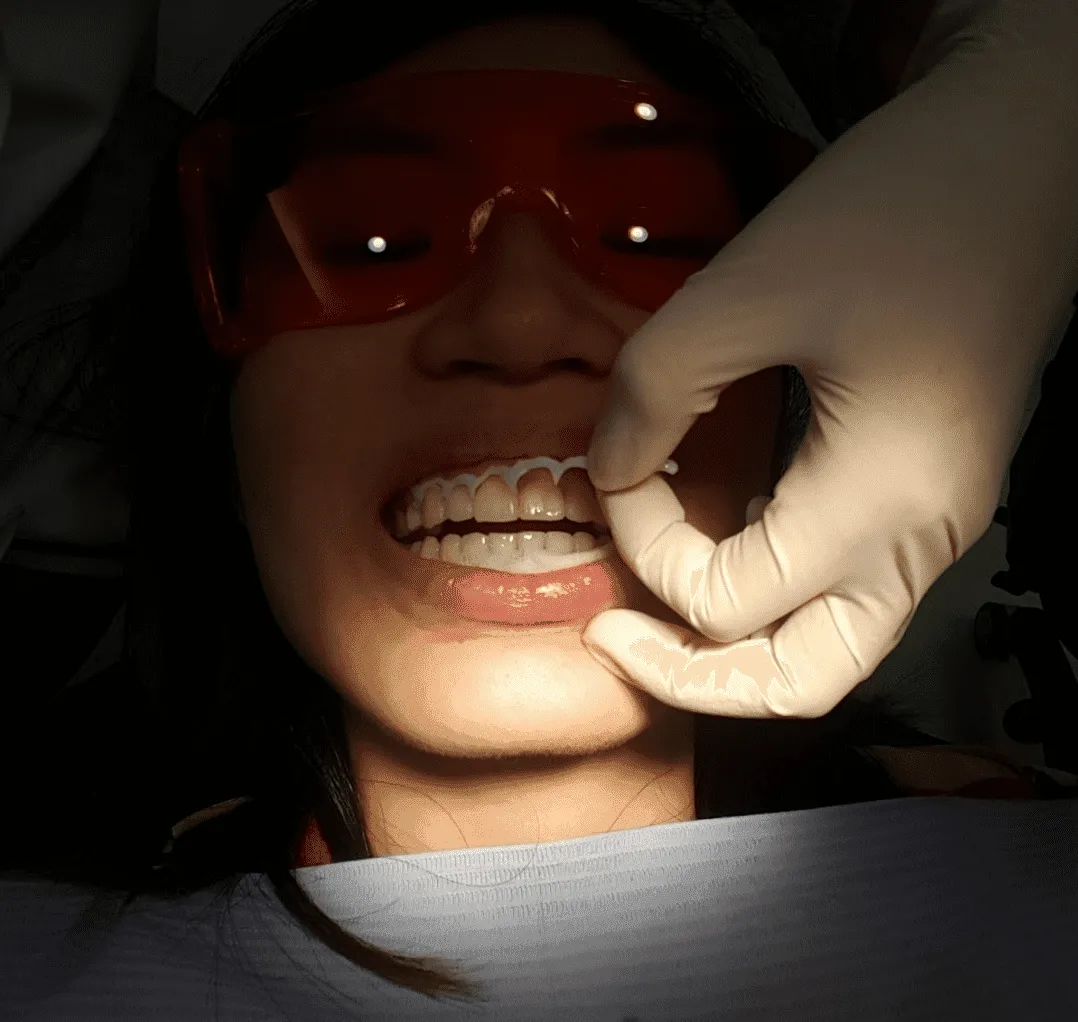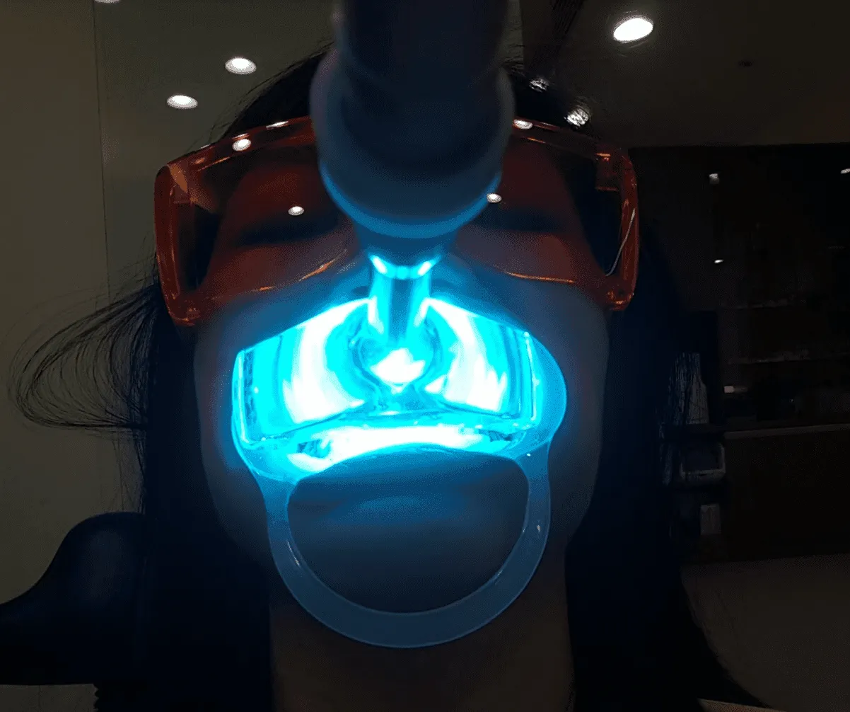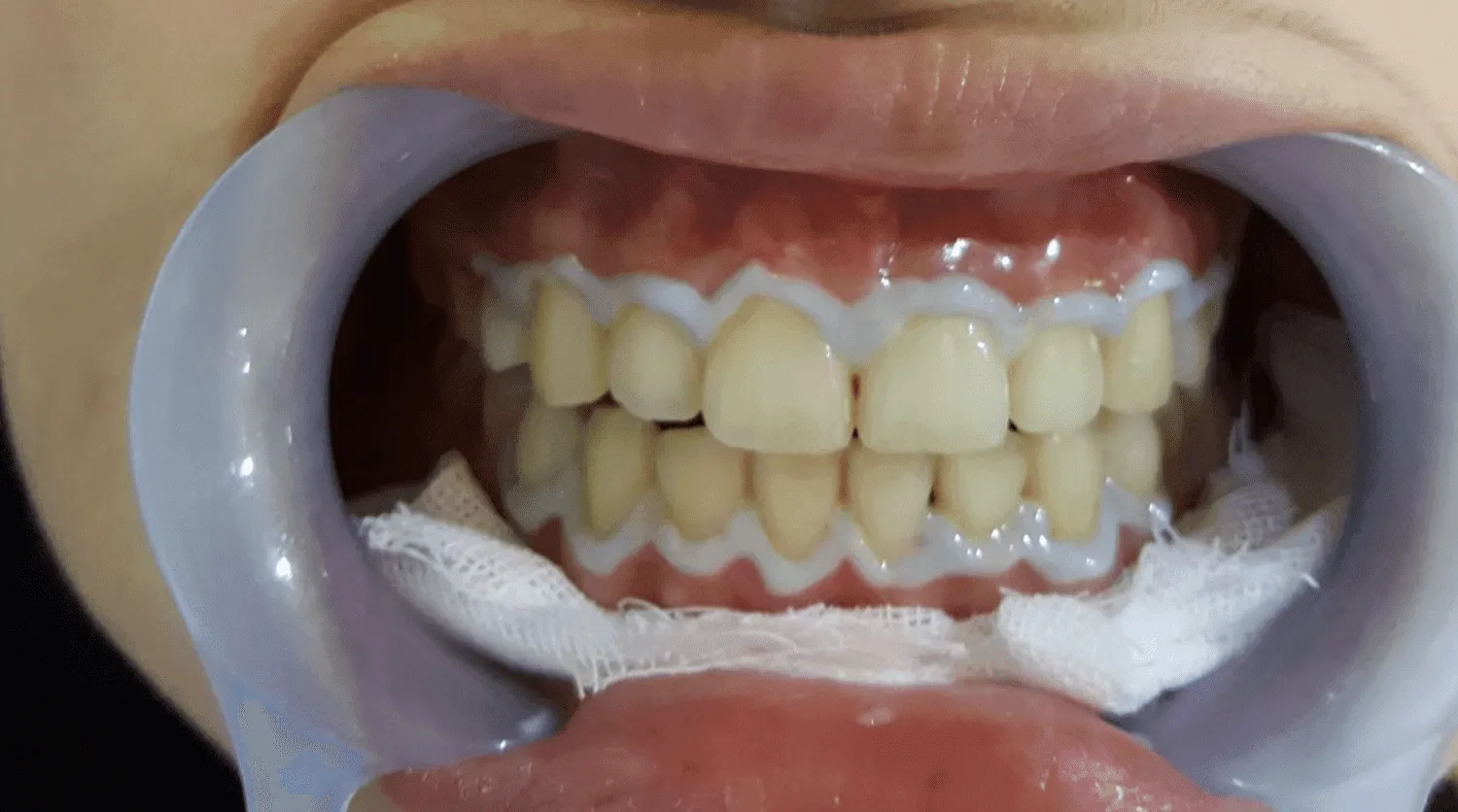 ↓ 牙齦保護劑是一個照光硬化(cure,就類似指甲「光療」的那種原理)的東西,用來保護牙齒美白藥劑的強氧化性傷害到牙齦