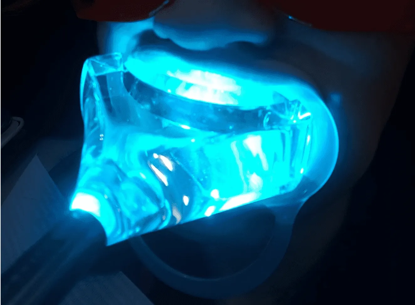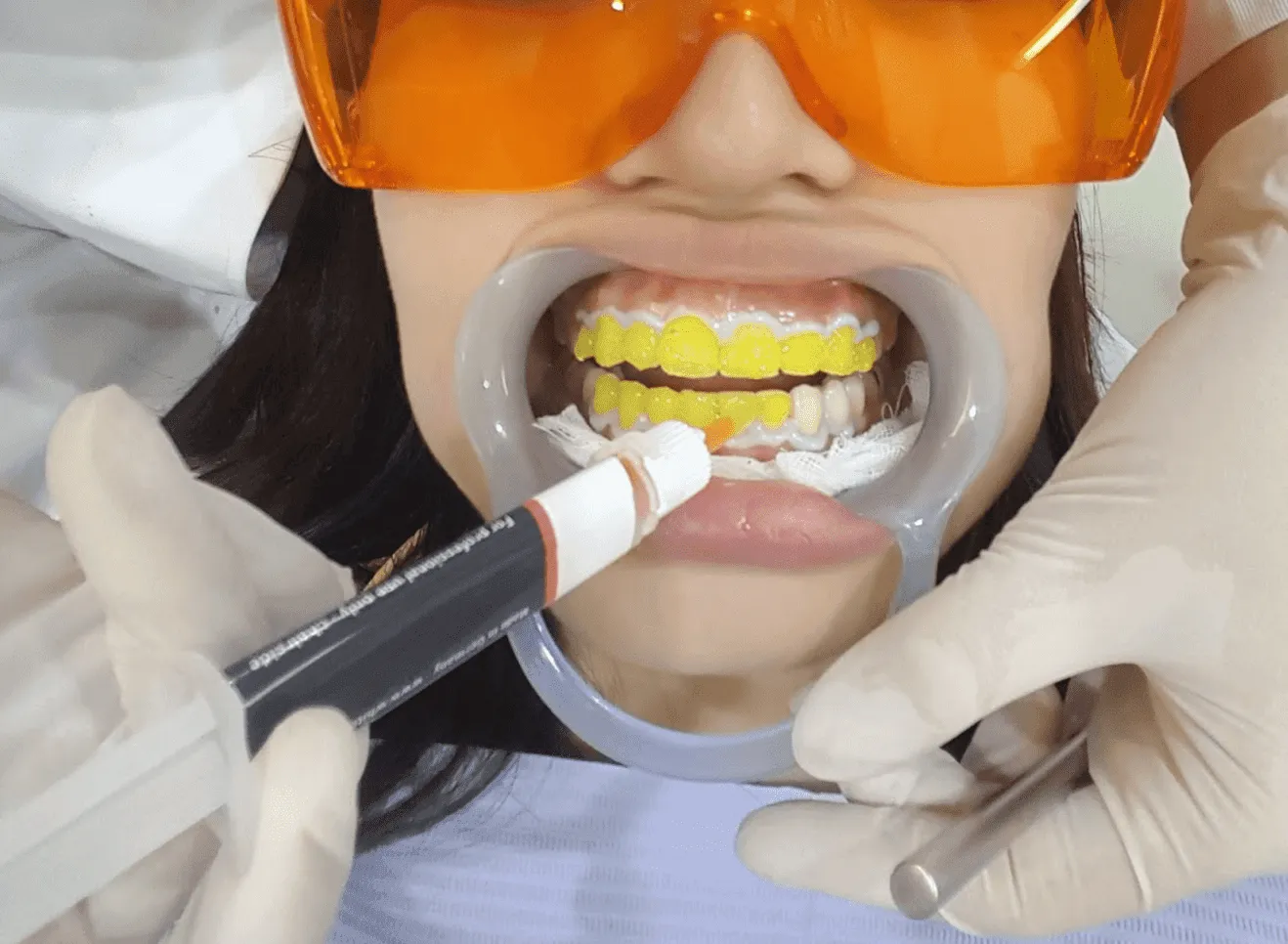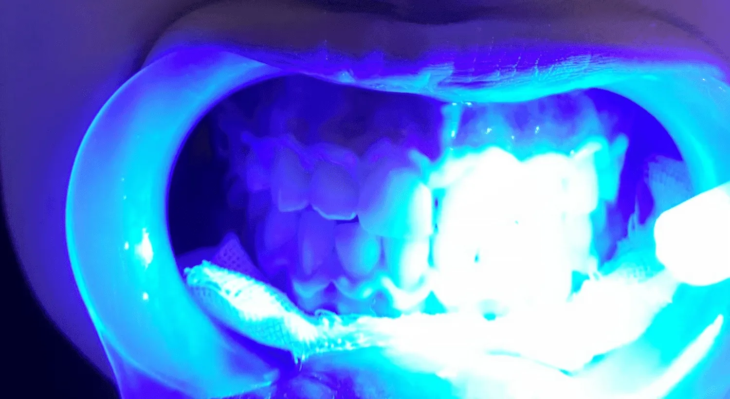 ↓ 牙齦保護劑是一個照光硬化(cure,就類似指甲「光療」的那種原理)的東西,用來保護牙齒美白藥劑的強氧化性傷害到牙齦