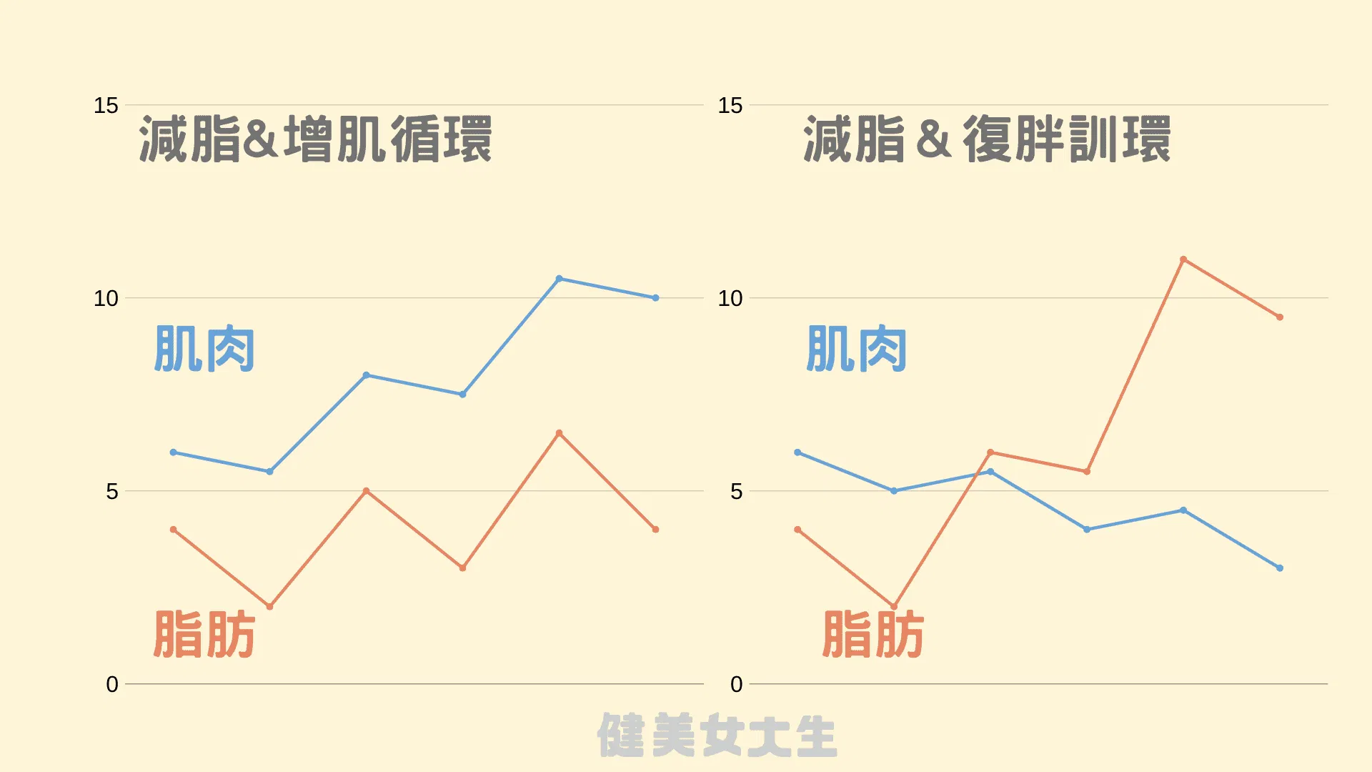 只要讓自己的任何一次減脂,從長得像右圖,變成長得像左圖,你就打破了這個惡性循環,開始累積身體的旅程!