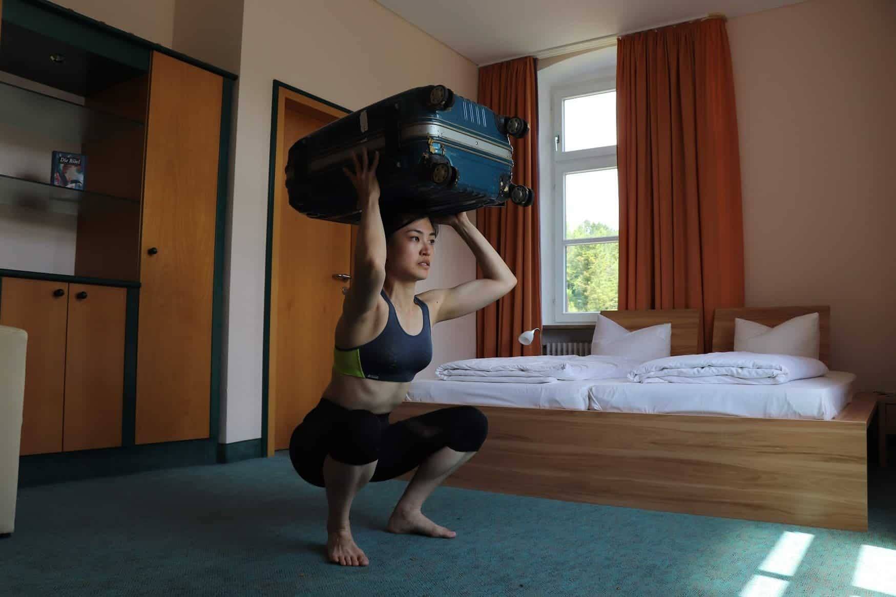 如果你有個27寸行李箱,你差不多等於帶了個5到20公斤的啞鈴在身。不過旅行箱沒有啞鈴那麼好抓、也很難放近身,所以我選擇了扛在頭上的方式。不過你不一定要如法炮製,在《健身從深蹲開始》裡,我有介紹很多單腳蹲的動作,訓練效果不亞於扛個20公斤在頭上做徒手深蹲喔!