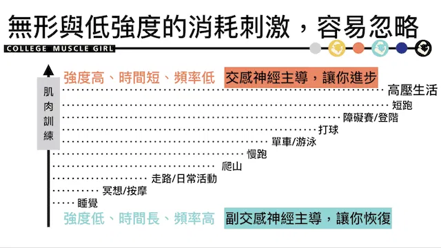 高強度訓練主要刺激我們的交感神經,而低強度訓練,則由我們的副交感神經主導。當所有的身體活動都偏向交感神經主導的方向時,身體可能會做一些調整: