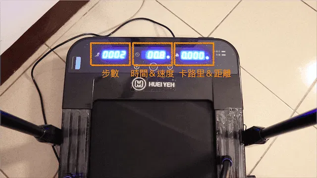 跑步機面板。左邊可顯示步數、中間為時間與速度切換著顯示、右邊則是卡路里與已跑距離: