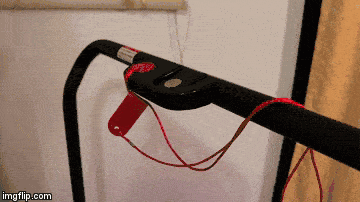 把紅色安全磁扣夾在衣服下擺後,使用遙控器對準腳前方的面板,按下開始,按住加速鍵,跑步機就會慢慢加速(最高速度到 8 公里/小時):