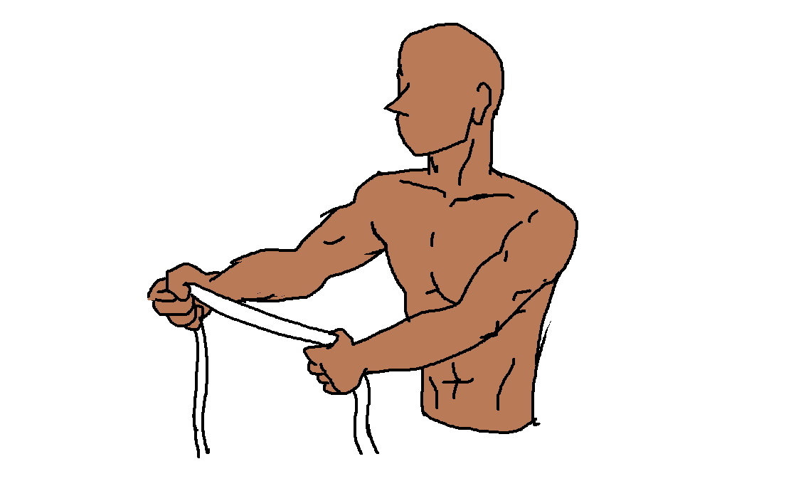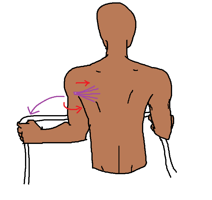 - 粉紅色:請先準備一條彈力繩。彈力繩的好處就是你可自由調整負荷,想要負荷大一點就握窄一點、負荷輕一點就握寬一點。一開始先兩手伸直(但手肘微彎)在身體前面,繩子調整到有一點點拉緊就可以了,手肘稍微有點向外,然後兩手手掌心是面對面的(手掌心向下其實也可以,但是那樣會讓你張到最開的時候肩膀壓力變大)。接下來就是慢慢往外拉開(下圖紅色長箭頭)直到拳頭幾乎到身體兩側,就可以慢慢收回,然後重複。這個動作讓你的肩胛骨被粉紅色那束肌肉拉著往內縮(下圖紅色短箭頭),所以你要想像你的肩胛骨用力往內夾。注意手張開快到身體兩側時盡量不要聳肩,還有手肘關節是不動的,從頭到尾只有你的肩關節在動。其他:反向飛鳥(reverse fly)、高姿划船(high row)。