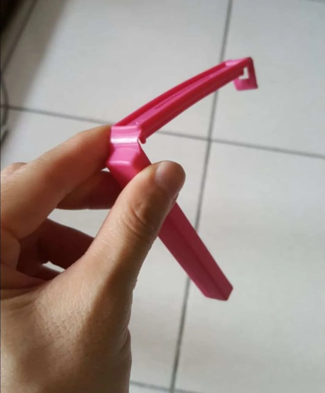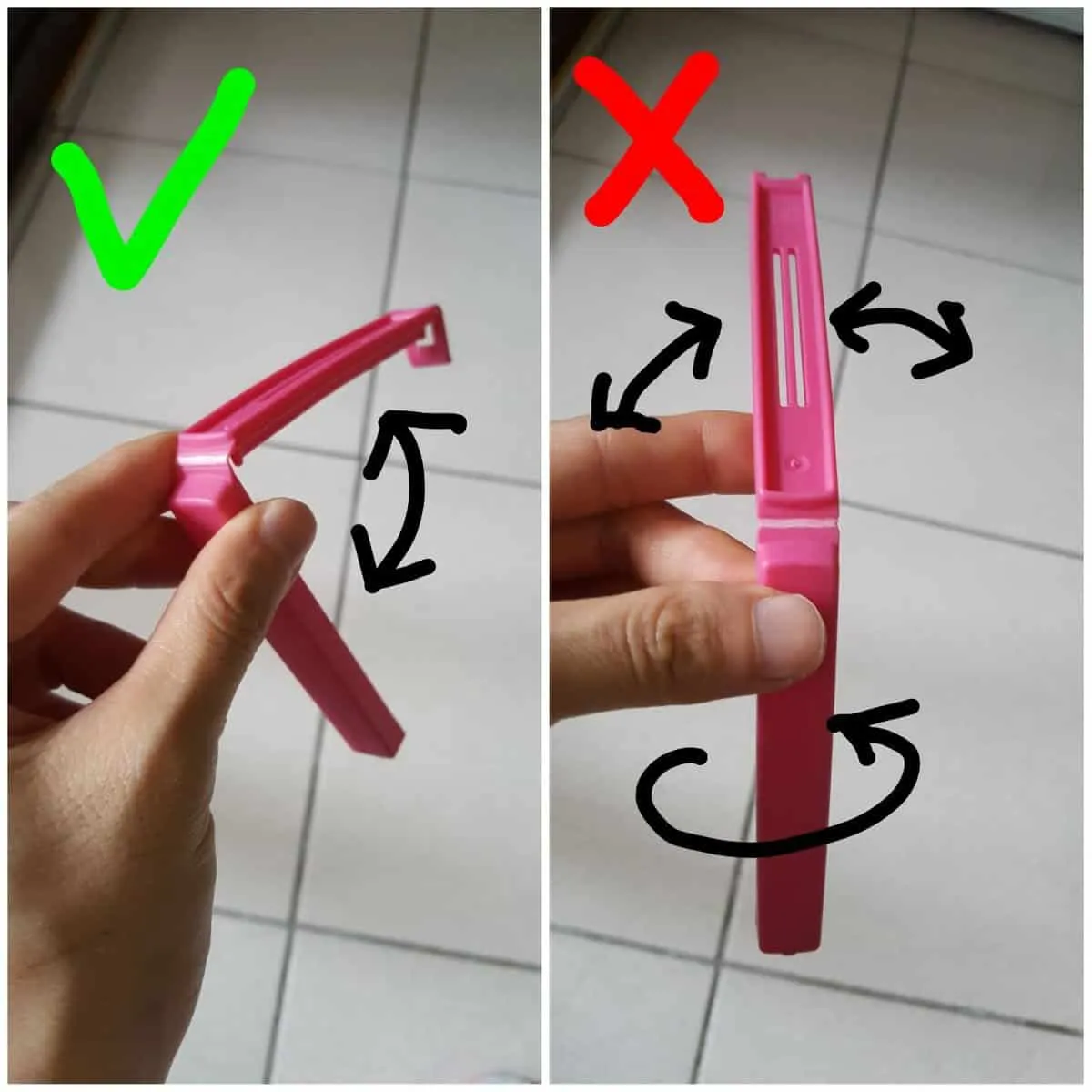 這個封口夾是一個「樞紐關節(hinge)」,意思就是:他只能往一個方向動,也就是夾起來或打開。如果你今天試圖把它往完全不一樣的另一個方向折,除了很難折以外,重點是也很容易壞,因為那不是他該有的活動方向: