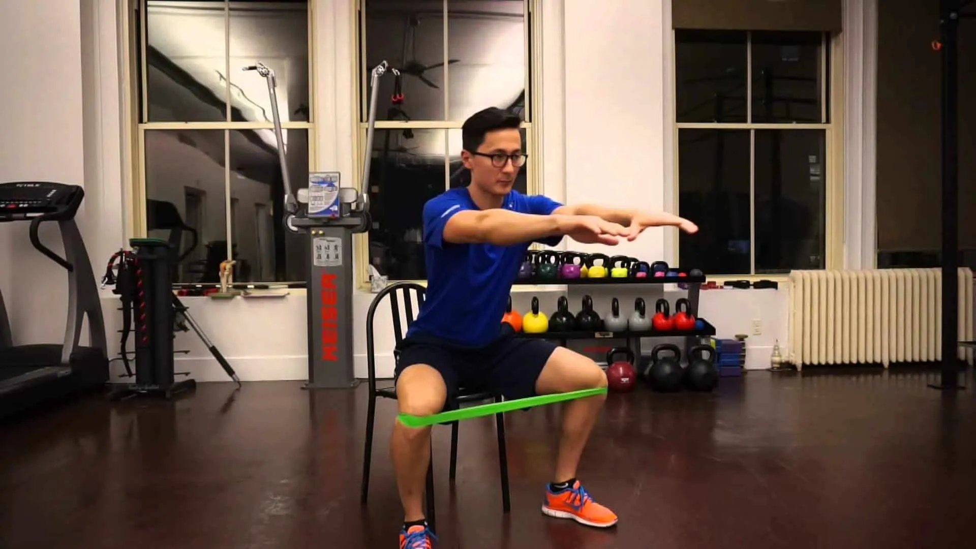 練習方式:在徒手深蹲的過程中,全程注意腳掌重心平衡的情況下,用一隻手從外往內推著你的同側膝蓋,讓膝蓋在深蹲動作全程「抵抗著這個推力」。「維持大腿打開的張力」的感覺,會有點像這樣。你會覺得你的屁股有出力的感覺。