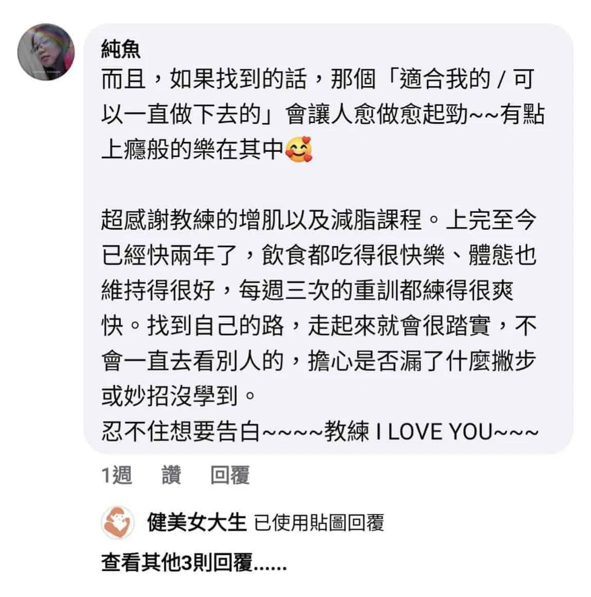 臉書的演算法就是這麼有趣,點過幾個跟減重相關的訊息之後,它就會排山倒海的將所有類似廣告都一股腦塞過來,我就這麼看到女大生的減脂課。從以前就有斷斷續續的看過教練的部落格,非常非常喜歡教練對很多知識的詮釋與反思,這次在我仔細爬過粉絲頁與部落格釋出的課程片段資訊後,讓我產生一種「就是它了」的感覺。就像《驚人習慣力》作者說的,「當有效果的東西一出現,你就可以看得出來哪些東西沒有效」。