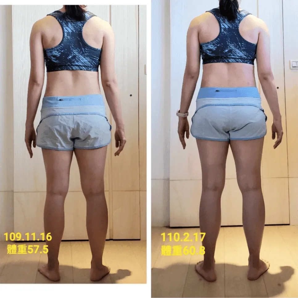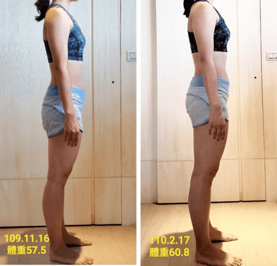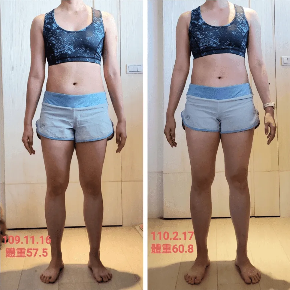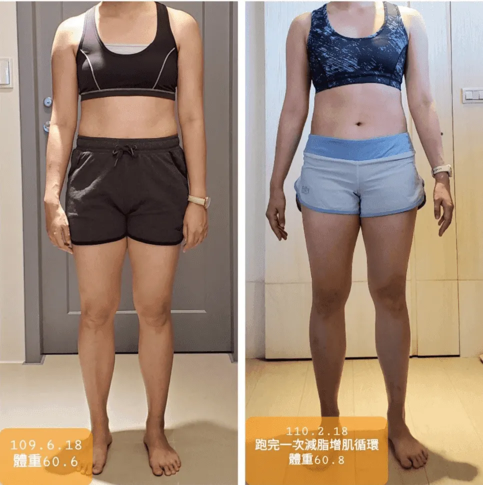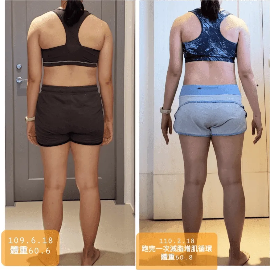 經過這次的課程也讓我比較能平常心看待增肌期體重體脂的增加,因為這是必然的過程,最終目的都是要達到改變身體組成。而且我更驚喜的發現,在一次的減脂加增肌的循環中,體重下降後又上升到跟原本一樣,但體態卻完全不同。